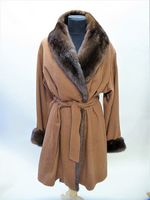 Yves SALOMON : Manteau en laine cachemire et Angora ocre, col châle et revers de manches longues en Vison pastel, deux poches. Taille 40-42 environ. + Ceinture.