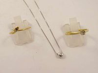 2 bagues en or 750 mil (diamant brillanté, saphir) (TDD : 53,5 et 52), collier à maillons vénitiens en or gris 750 mil retenant un pendentif (diamant brillanté). (Longueur : 38 cm). 5,2 g.