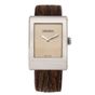 BOUCHERON. Montre d'homme rectangulaire (34,5 x 24 mm) en acier. Lunette galbée. Fond à vis. Cadran gris clair « soleil ». Mouvement quartz. Bracelet cuir marron (*). Boucle ardillon en acier, signée Boucheron. N° de série : AL 436050. Sans écrin ni papiers.