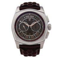 ROGER DUBUIS, La Monégasque. Montre d'homme tonneau (44 mm) en acier. Lunette tonneau, satinée et polie, ouverture ronde. Fond squelette à vis. Cadran gris foncé, chiffres arabes et index en applique, deux compteurs. Mouvement mécanique faisant chronographe, à remontage automatique. Trotteuse centrale, roue à colonnes. Poinçon de Genève. Calibre RD 680, N°856. Bracelet cuir marron. Boucle dépliante en acier signée. Roger Dubuis. Référence : PA83FW. N° de série : 86300. Écrin. Sans papiers.