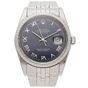 ROLEX, Datejust.  Montre d'homme ronde (diamètre : 35 mm) en acier. Lunette striée. Fond vissé. Cadran bleu, chiffres romains en applique. Mouvement mécanique à remontage automatique, trotteuse centrale, datographe guichet à 3h. Bracelet « Jubilé ». Fermoir acier (62510H/AD 10). Référence : 16220. N° de série : F 132745 (circa 2004/2005). Poignet maximum : 16,7 cm. Sans écrin ni papiers.