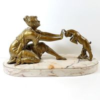 Geo MAXIM (1885-1940) "Jeune fille au cabri" sujet en régule à patine dorée, sur socle en marbre, signé sur le côté. Dim. : 30 x 51 x 20 cm. (Eclats au niveau de la patine et du marbre).