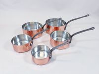 Batterie de 5 casseroles en cuivre étamé, les manches noirs en fonte. Cachet « fabrication française ». Sans marque visible. Diam. de 12.3 cm à 20.4 cm. Usures internes visibles dans les 2 petites (celles à 14.7 et 12.3 cm de diam.) TBE général.