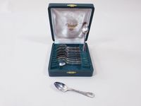 CHRISTOFLE, RUBANS, XXe siècle : 12 cuillers à moka en métal argenté. Signées. Poinçon période 1935-1983. Production moderne. L. 10.1 cm. TBE. Ecrin de la maison. Non chiffrées.