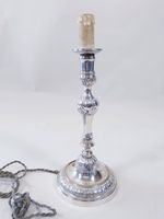 Flambeau en bronze argenté de la fin du XIXe siècle, modèle à base ronde, fût balustre et bobèche amovible. Décor à frises de perles et feuilles d’acanthes. La base percée pour l’électricité. TBE. Monté pour l’électricité période moderne. Cordon usé à la base. Sans garantie. H. 34 cm.