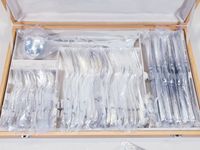GUY DEGRENNE, période contemporaine : ménagère BLOIS de 49 pièces en acier argenté et inox, modèle baguette comprenant 12 grands fourchettes, 12 grandes cuillers, 12 grands couteaux lames signées, 12 cuillers à café et 1 louche. Signée. Poinçon d’orfèvre, argenture qualité 1. Dans leurs blisters. Etat neuf. Coffret bois signé.