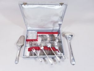 LE COUVERT FRANÇAIS, Années 1940-1950 : Partie de ménagère de 48 pièces en métal argenté à spatules tonneau moulurées comprenant 12 grands couverts, 10 cuillers à café, 12 fourchettes à gâteaux, 1 pelle à tarte et 1 louche. Poinçon de fabricant LCF dans écu couronné. Ecrin légèrement défraîchi. Rayures d’usage. Non chiffrée.