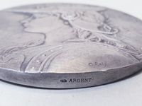 Médaille commémorative en argent 950 mil. du CENTENAIRE DE LA BANQUE DE FRANCE 1800-1900 figurant sur la face « Athéna casquée » dite Athéna d’après le médailliste O. ROTY et sur l’avers « CONFIANCE ET TRAVAIL » d’après le peintre ADRIEN ARMAND. Poinçon de la Monnaie de la corne d’abondance avec la mention ARGENT sur la tranche. Vers 1900. Poids : 126.3 g. Diam. 6.8 cm. Rayures d’usage.
