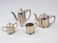 Service à thé-café de 4 pièces pour l’hôtellerie en métal désargenté, modèle tronconique sur piédouches ronds et frétels boule comprenant une théière (H. 13.5 cm), une cafetière (H. 17.8 cm), un pot à lait (H. 7.9 cm) et un sucrier couvert (H. 10 cm). Travail moderne. Non chiffrés.