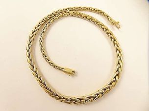 1 200 / 1 600 €Collier deux ors 750 mil centré d'un diamant brillanté de 0,30 carat environ dans un pavage de diamants brillantés. (Longueur : 43 cm environ). 51,1 g.