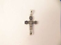 Pendentif-croix en or gris 750 mil serti de diamants taille princesse et de saphirs calibrés (hauteur : 3,4 cm). 2,9 g.