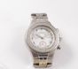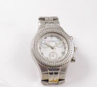 Bracelet-montre en acier, chronographe à boîtier rond et lunette tournante diamantées, cadran nacré à 3 compteurs secondaires, guichet dateur à 4H et index diamants, tour de bras à plaquettes acier articulées, TECHNOMARINE, mouvement quartz.