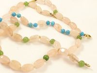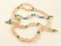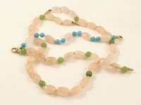 Collier et 2 bracelets composés de quartz roses polis agrémentés de perles de pierres décoratives ou de pierres fines, fermoirs en or 750 mil. (Longueur bracelet : 17,5 cms). 91,9 g. brut