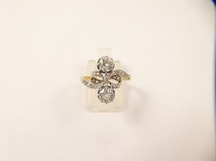 300 / 350 €Bague noeud "toi et moi" 2 ors 750 mil ornée de 2 diamants TA de 0,25 carat environ chacun rehaussés de roses (TDD :50,5). (Legers éclats). 2,7 g.