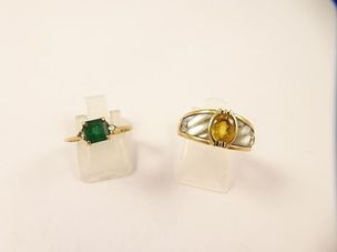 200 / 300 €2 bagues en or 750 mil dont une STERN (émeraude carrée, diamants brillantés) (égrisures) et 1 sertie d'une pierre jaune et de nacre (fêles, usures, égrisures). (TDD : 53). 8,6 g.