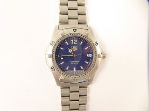 150 / 200 €Bracelet-montre TAG HEUER en acier, boîtier rond, lunette tournante graduée, cadran bleu, index bâton et chiffre arabe appliqués luminescents, guichet dateur à 3H, mouvement à quartz, bracelet et boucle déployante en acier, signé et numéroté (diamètre : 39 mm). (Manque à l'émail et boucle incomplète).