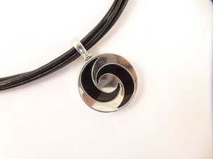 300 / 500 €Pendentif BULGARI "Optical" en or gris 750 mil, onyx et acier, partie supérieure tournante créant une illusion d'optique, signé, accompagné d'un collier BULGARI composé de 5 brins de cuir noirs retenus par un fermoir en or 750 mil, signé, le tout dans un bel écrin BULGARI (diamètre : 3 cm). (Longueur : 38 cm) .44,1 g. brut