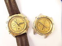 2 montres SEIKO chronographes en acier et métal doré dont une sur bracelet cuir usé avec boucle ardillon en métal, boîtiers ronds, lunettes graduées, cadrans dorés à 3 compteurs, index points appliqués luminescents, guichets dateurs à 3H, mouvements à quartz, signées et numérotées. (Diamètre: 39 mm). (Usures, rayures et manques).