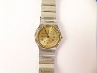 Bracelet-montre de dame BAUME ET MERCIER en acier et métal doré, petit boîtier rond, cadran doré à index point appliqués et chiffres romains peints, mouvement à quartz, bracelet et boucle déployante en acier et métal doré, signé et numéroté. (Diamètre : 22 mm). (Légères rayures).