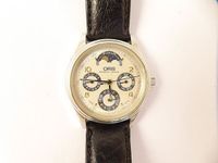 Montre-bracelet ORIS en acier, boîtier rond, lunette godronnée, cadran crème guilloché, calendrier complet et phase de lune, index bâton et chiffres arabes appliqués, mouvement automatique apparent, fond de boîtier transparent, bracelet en cuir usé noir, boucle ardillon signée en acier, signée et numérotée, accompagnée de ses papiers et de son tournevis. (Diamètre : 34 mm) .