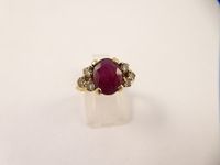 Bague en or 750 mil ornée d'un rubis traité ovale épaulé de dts brillantés (TDD : 51) (égrisures). 3,5 g.