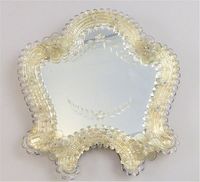 Petit miroir à bords chantournés en verre gravé à décor de guirlandes de fleurs et verre de Venise. Sur support en bois. XXème siècle. Dimensions : 26,5 x 25 cm. On y joint : Miniature en émaux de Limoges sur cuivre figurant un paysage de campagne automnal. Signé « G. CANDELIER Limoges ». Encadrée. Diamètre à vue : 6,3 cm. Dimensions cadre : 11 x 11 cm.