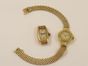 Bracelet-montre de dame en or 750 mil, boîtier rond, cadran beige à chiffres arabe, tour de bras en or 750 mil à maillons articulés (Long : 17,5 cms), MOVADO pour CLERC; Montre sans bracelet en or 750 mil, boîtier tonneau, cadran beige à chiffres arabe, mouvement mécanique. 28,1 g brut.