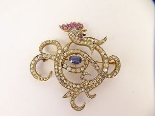 600 / 800 €Broche à décor de coq et volutes en or 750 mil serti d'un saphir ovale (chauffé), de roses, de rubis et d'une pierre orange pour l'oeil. (Dim. : 5,8 x 5,8 cm). (Pierres cassées, égrisures, restauration au niveau de l'épingle). 20,6 g. brut