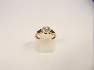 120 / 180 €Bague en or 750 mil (diamant TA de 0,45 carat environ, saphirs taille poire). (TDD : 53). (Egrisures). 2,8 g.