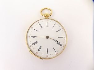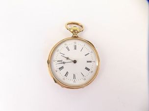 250 / 350 €Montre de gousset en or 750 mil, les heures indiquées en chiffres romains, mouvement mécanique (cuvette en métal). (Email légèrement accidenté). 58,4 g. brut