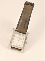 HERMES Paris Swiss made n°HH1.810/2803352 : Montre « Heure H TGM » en acier, cadran blanc 30mm, chiffres arabes, mouvement quartz, bracelet en veau taupe. Longueur : 19cm. (Usures, égrisures, bracelet en l’état).