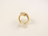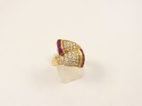 Bague croisée en or 750 mil ornée de 2 pavages de diamants brillantés soulignés de pierres rouges calibrées. (TDD : 54). 6,3 g.