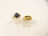 Bague rosace 2 ors 750 mil ornée d'un saphir rond entouré et épaulé de roses (TDD : 53) (pierre manquante) et bague en or 750 mil (diamants 8/8) (TDD : 48). 6,6 g.
