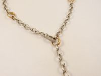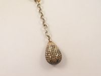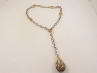 Collier en or gris et or rose 750 mil à maillons jaseron retenant un pendentif "goutte" pavé de diamants brillantés blancs, bruns et noirs, le fermoir également pavé de diamants brillantés (longueur : 42 cm environ, hauteur de la goutte : 3 cm). (Pierre manquante, pierre cassée). 65,2 g.
