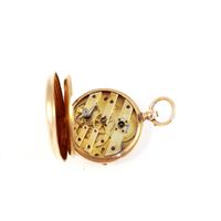 Montre de col en or 750 mil., cadran blanc à chiffres romains, dos guilloché à décor floral à rehauts d’émail noir et bleu, mouvement mécanique, cuvette en or 750 mil. Poinçon Départements (1838-1919). 30,3 g. brut.