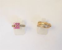 Anneau triple 3 ors 750 mil. (diamants 8/8) (TDD : 55) ; et bague 2 ors 750 mil. (saphirs roses, diamants 8/8) (TDD : 51). (Pierre manquante, monture légèrement déformée). 6,7 g brut