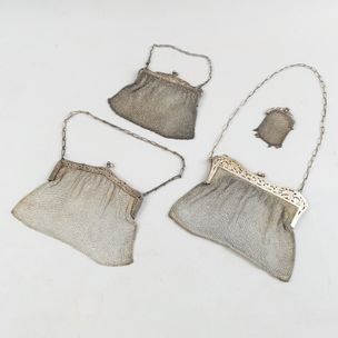 150 / 200 €3 sacs du soir et 1 petite bourse en argent 800 mil. à cottes de maille, les fermoirs à gravure et ciselure florale ART NOUVEAU de feuilles de gui pour 2 et fleurettes pour les 2 autres, les deux grands repercés. Petits manques. Travail vers 1900. Poinçons : Tête de sanglier pour 3 et le plus grand à charançons d'importation. Poids total : 794.6 g. H. des sacs sans les anses : de 9 cm à 17.5 cm.