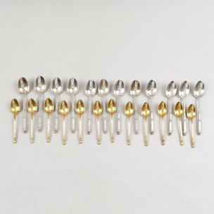 30 / 60 €Suite de 12 cuillers à café en métal argenté à décor néo-classique de palmettes, canaux et lauriers par ROUX-MARQUIAND (écrin) et suite de 12 cuillers à moka en métal doré, les tiges à la russe (écrin Apollo). TBE