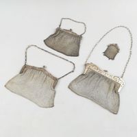 3 sacs du soir et 1 petite bourse en argent 800 mil. à cottes de maille, les fermoirs à gravure et ciselure florale ART NOUVEAU de feuilles de gui pour 2 et fleurettes pour les 2 autres, les deux grands repercés. Petits manques. Travail vers 1900. Poinçons : Tête de sanglier pour 3 et le plus grand à charançons d’importation. Poids total : 794.6 g. H. des sacs sans les anses : de 9 cm à 17.5 cm.