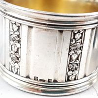 ARGIT, premier tiers du XXe siècle : timbale tulipe à petit ressaut (H. 8 cm), coquetier tulipe (H. 6.5 cm – piqûres internes) et rond de serviette (Dim. 3.8 x 5.5 cm), modèle à guirlandes de roses et cannelures. Légères rayures. TBE. Non chiffrés.