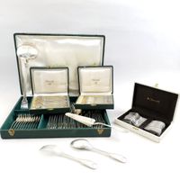 CHRISTOFLE, ARCANTIA, XXe siècle : ménagère de 76 pièces en métal argenté, modèle filet coquille comprenant 12 grandes fourchettes, 12 grandes cuillers, 12 fourchettes à escargots, 12 fourchettes à huîtres, 11 cuillers à café, 11 fourchettes à gâteaux, 1 pelle à tarte et 1 louche. Signée. Poinçons période 1935-1983. Production moderne. Légères rayures. TBE, 4 écrins CHRISTOFLE.