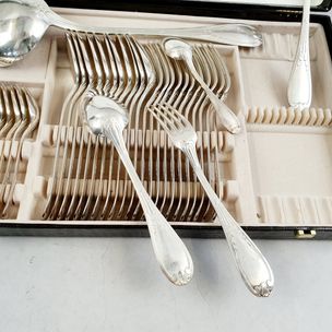 Corbeille à fruits en porcelaine blanche ajourée à décor de fraisiers, travail moderne. Dim. 5.8 x 23.5 cm. + Pot de toilette rond en cristal à pans, son couvercle en argent (950 mil.) à gravure Néo-Renaissance de rinceaux et rosace. Minerve 1er titre. Poids net : 19.4 g. Diam. 6.3 cm. H. 4.5 cm.+ Lot en métal argenté : - 10 cuillers à moka modèle filet par Sté NPA après 1983. TBE. - 1 cuiller à œuf tonneau Art Déco par APOLLO. + 1 coupelle monture métal et coquille nacre (accidents).