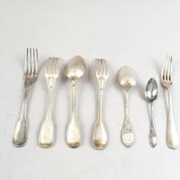 Lot de couverts en argent (950 mil.), Minerve 1er titre, de différents orfèvres et modèles comprenant : - 3 grandes fourchettes et 1 grande cuiller filet, armoiries comtales. SECOND EMPIRE. Poinçon de la Veuve JAMET (active après 1847) (poids : 311.6 g). - 1 grande fourchette baguette chiffrée DL par PDA, 1 cuiller à entremets et 1 cuiller à café ART NOUVEAU par CT, monogrammées CD (poids : 155 g). Poids total : 466.6 g. Usures et rayures d’usage.