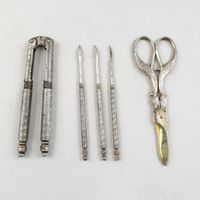 Lot de la fin du XIXe-début du XXe siècle en métal argenté, métal doré et métal : - 1 casse noix (H. 12.7 cm) et 5 piques à crustacés (L.12.5 cm) à décor guilloché tournoyant de perles et ondes. Piqûres et usures. - 1 paire de ciseaux à raisins à décor en col de cygne de palmettes et cornes d’abondance. Piqûres et usures. - 6 porte-couteaux à décor bambou Second Empire. Oxydations. L. 8.5 cm. H. 3.9 cm.