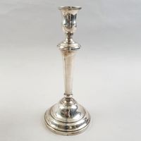 PUIFORCAT, XXe siècle : grande timbale tulipe formant vase ou seau à glace, modèle sur piédouche rond à godrons et moulures de filets. Nouveau poinçon de fabricant post 1983. H. 14 cm. Rayures et usures internes. Non chiffrée.+ J. HENIGER XIXe siècle : bougeoir rond en métal argenté à moulures de doucine, le binet tulipe. Base fourrée avec fentes sur la doublure. H. 24.5 cm.