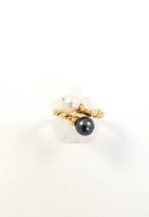 Bague « Toi et Moi » ouverte en or 750 mil sertie d’une perle de culture grise et une perle de culture blanche, le corps ciselé à effet de torsades. Travail français. (TDD : 50). 7,6 g.