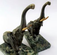 ERRAC (Ecole française du XXème siècle) Paire de serre-livres "Eléphants barrissant" en bronze patiné, l'un signé sur une patte, sur socles rectangulaires en marbre. Hauteur : 17,5 cm - Longueur : 13,5 cm. (Usures à la patine, restaurations et éclats sur les socles) .