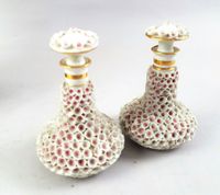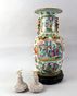 Lot comprenant : - Paire de flacons en porcelaine blanche et rose à filets or, et décor de fleurettes appliquées en relief. Hauteur : 13,5 cm. (Un bouchon bloqué, restaurations). - Grand vase en porcelaine de CANTON polychrome et or à décor de scènes de palais dans des réserves, papillons et fleurs, le fond vissé sur un socle en bois. Hauteur : 47,5 cm.