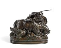 Antoine-Louis BARYE (1796 - 1875)Cavalier arabe tuant un sanglierBronze à patine brun vert nuancé. Première édition vers 1862. Sans doute une fonte de Brame entre 1876 et 1900. Signé « Barye » sur la terrasse. H. 26 cm. Dim. terrasse : L. 32,2 cm x l. 15,7 cm Bibliographie : Michel Poletti, Alain Richarme, Antoine Louis Barye. Catalogue raisonné des sculptures, Paris, Gallimard, 2000, p. 85, modèle répertorié sous le n°F16.