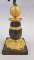 PAIRE DE CANDELABRES à quatre bras de lumière en bronze doré et bronze à patine brune, soutenus par des amours Le socle de forme balustre à fond guilloché repose sur une base carrée. Époque Louis-Philippe. H. 48,5 cm. L. 19 cm. P. 14 cm. (Usures et bobèches probablements manquantes )